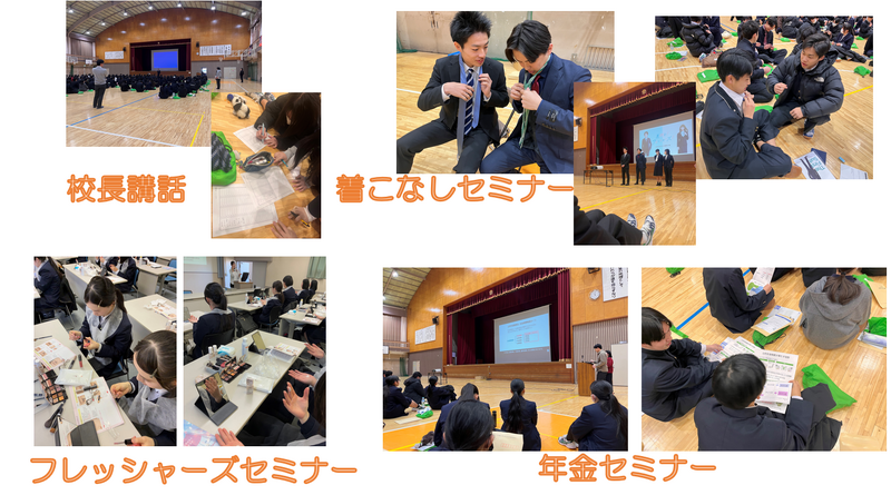 校長講話・着こなしセミナー・年金セミナーを行いました。また、女子の就職者に向けて